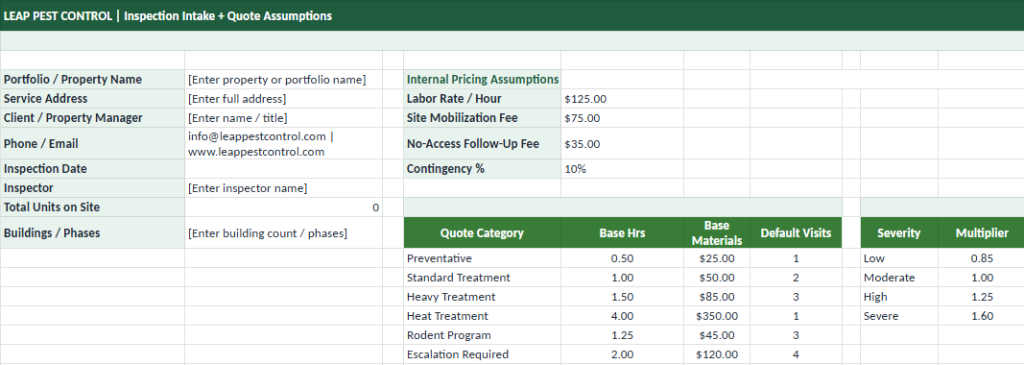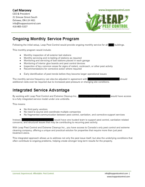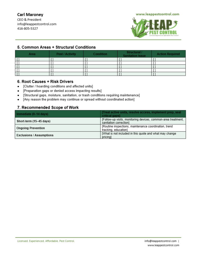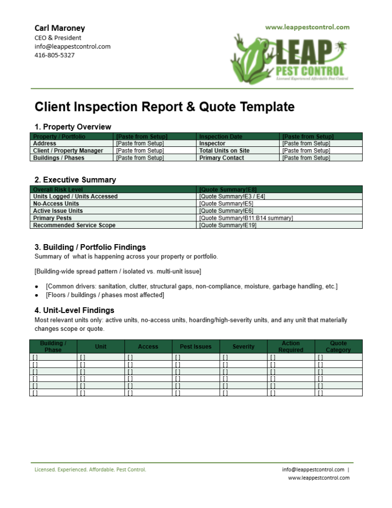 At Leap Pest Control, we don’t rely on basic service reports or generic inspections. Every inspection we complete follows a structured, data-driven system designed to give property managers full visibility into what’s happening across their units and buildings.
